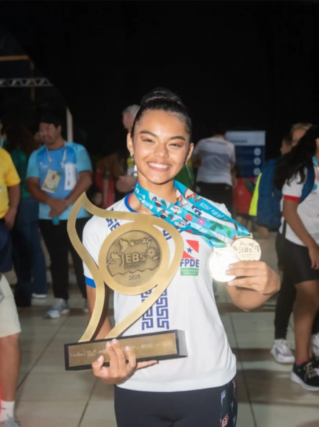 O Pará conquistou o ouro por equipe na ginástica rítmica, nos Jogos Escolares Brasileiros (JEBs) 2025, evento realizado em Uberlândia (MG). A delegação paraense contou com o apoio da Secretaria de Estado de Educação (Seduc), por meio do Núcleo de Esporte e Lazer (NEL), e se destacou nas provas individuais e coletivas. A estudante Júlia Nascimento, da Escola Estadual José Márcio Ayres, foi a única representante da rede pública estadual.