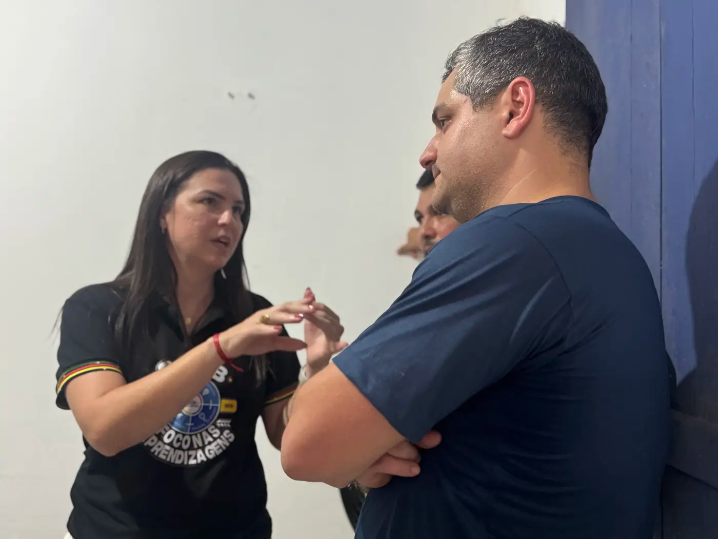 Secretário de Educação, Ricardo Sefer, em diálogo com a dirigente de Bragança, Thayse Alvão - Foto: Lilian Guedes / Ncom Seduc