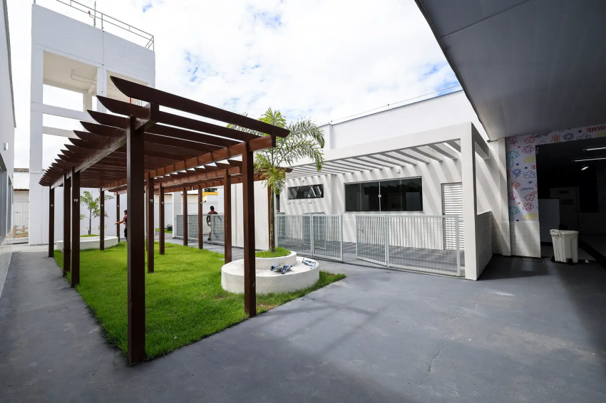 Na área externa, as crianças poderão desenvolver suas habilidades em um pátio coberto, que também terá playground; redário; horta e jardim, garantindo um ambiente acolhedor e propício ao desenvolvimento integral dos alunos.